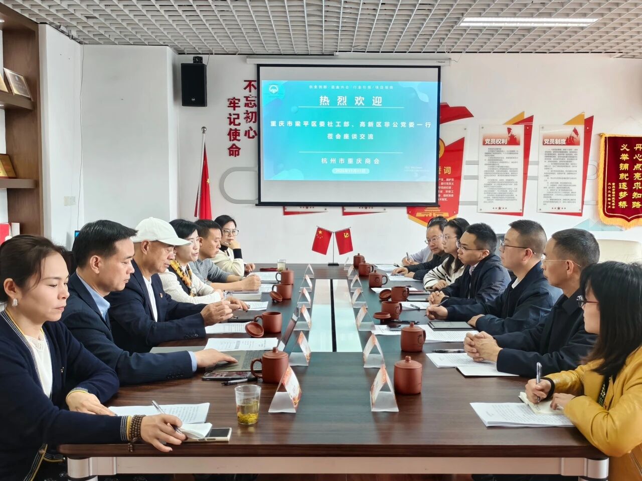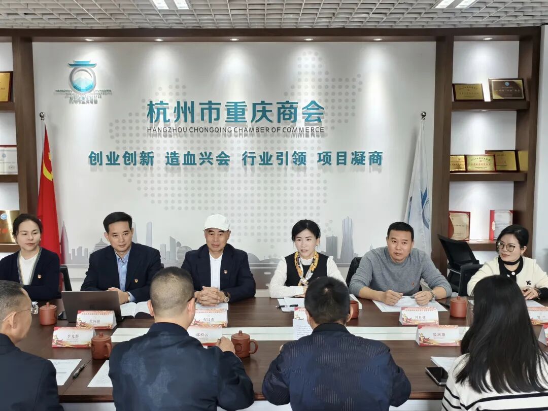 中共杭州市重庆商会支部委员会党支部书记段意娟,组织委员兼宣传委员冯世健,党员倪良森、张国强、周祉含,预备党员邹兰及秘书处热情接待并参与座谈。