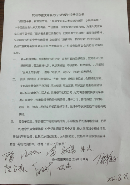 会议首先由会长王勇传达学习贯彻习总书记关于“坚决制止餐饮浪费行为,切实培养节约习惯“重要指示精神,弘扬勤俭节约的中华传统美德,加快形成“浪费可耻、节约为荣”的社会风尚,商会的所有会员,让我们从自己做起,从现在做起,发扬中华民族艰苦奋斗、勤俭节约的优良作风,杜绝“舌尖上的浪费。